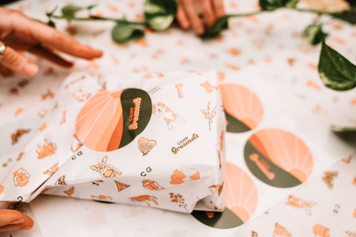 People describe being at Camp Grounds coffee shop as a special experience and I wanted to capture that with the packaging designs. The 70s vintage patterned cups, iconic potted greenery and familiar dog faces are some of things you will see in the tissue paper and when you visit the shop. I sketched these in Procreate with the Apple pencil to get a hand-drawn feel before playing around with colour and repetition in Adobe Illustrator. The sticker is a nod to the hilly landscape that hugs our little town. The aim with this packaging was to reflect the simplistic but special nature of the shop. It is both fun, minimal but nothing too polished with visual connections to the things that make the coffee shop and Tamworth special.