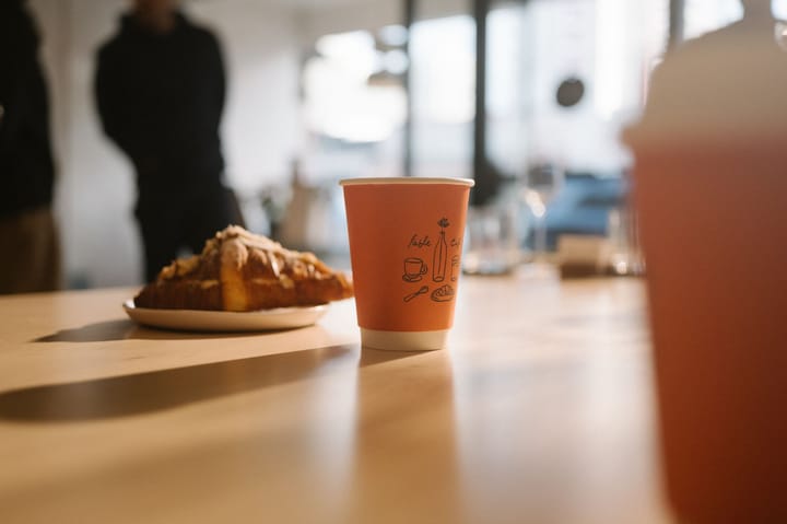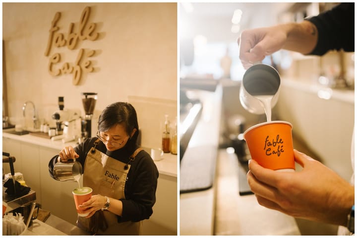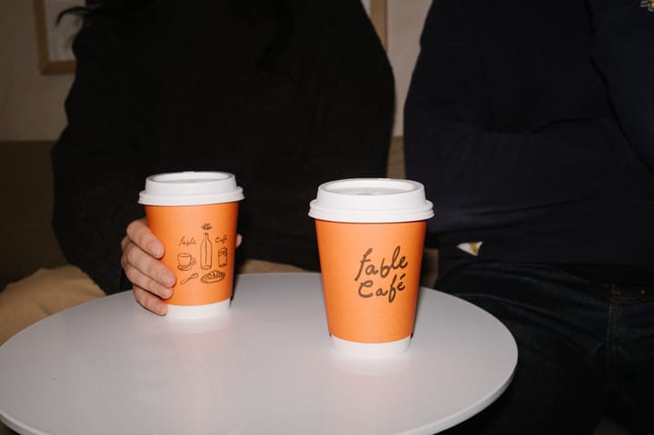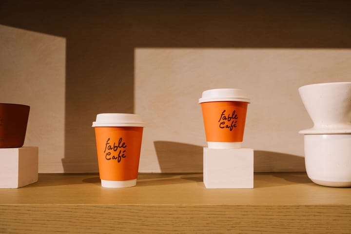 Every cup is served in Fable's own stoneware. Every to-go order leaves in packaging that holds the same standard. Double-walled, matte-finished, printed with the kind of care that suggests someone actually thought about it.
